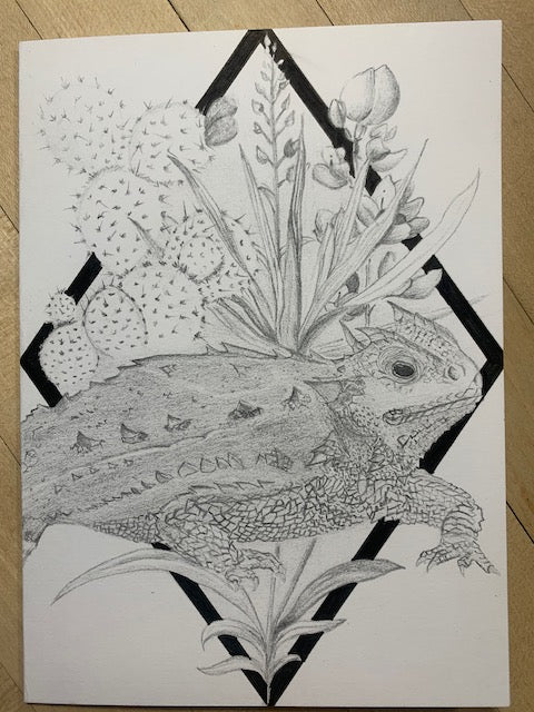 With its rough, textured skin and fine, scale-like detail, the horned lizard is brought to life with care and precision. Surrounding it are classic symbols of the Texas landscape: blooming bluebonnets and prickly pear cacti, arranged in a natural composition that evokes the wild charm of the Hill Country.